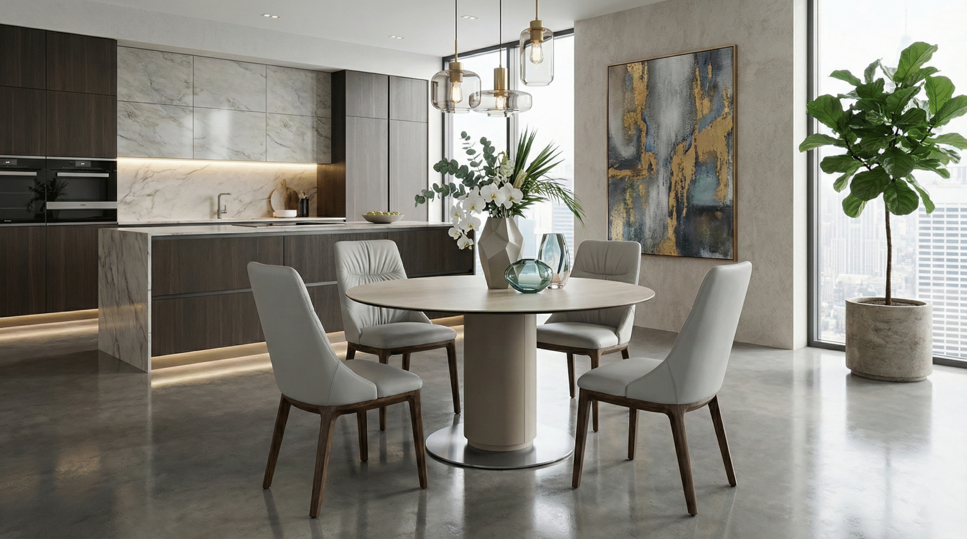The Atlas is more than just a table; it’s a solution. Its intelligent revolving mechanism allows the taupe slate matte ceramic top (travertine style) to glide open, expanding from a chic console into a generous round table ready for any occasion. The ceramic surface isn’t just beautiful—it’s built for real life, offering exceptional resistance to scratches, stains, and heat.