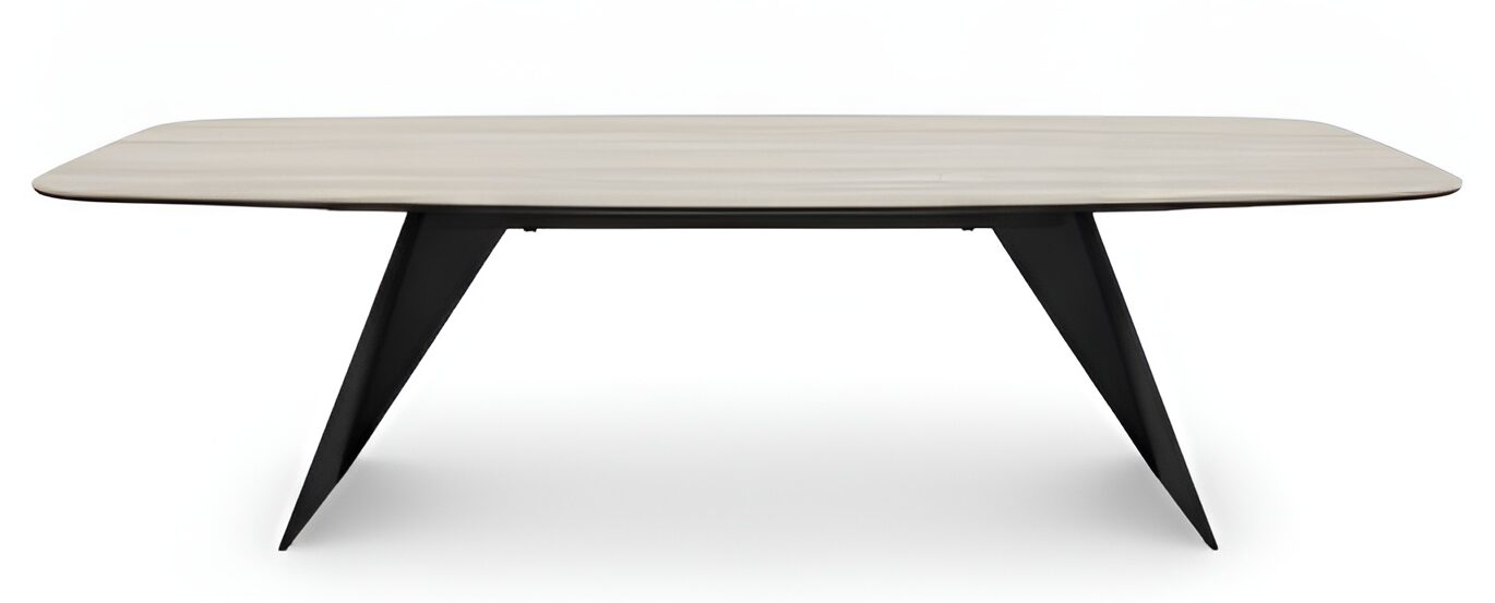 Make a statement with this exquisite dining table, where minimalist design meets the timeless luxury of Italian stone. The sleek, rectangular Travertine top is complemented by a bold, angular metal base, making it an ideal choice for modern and contemporary interiors.