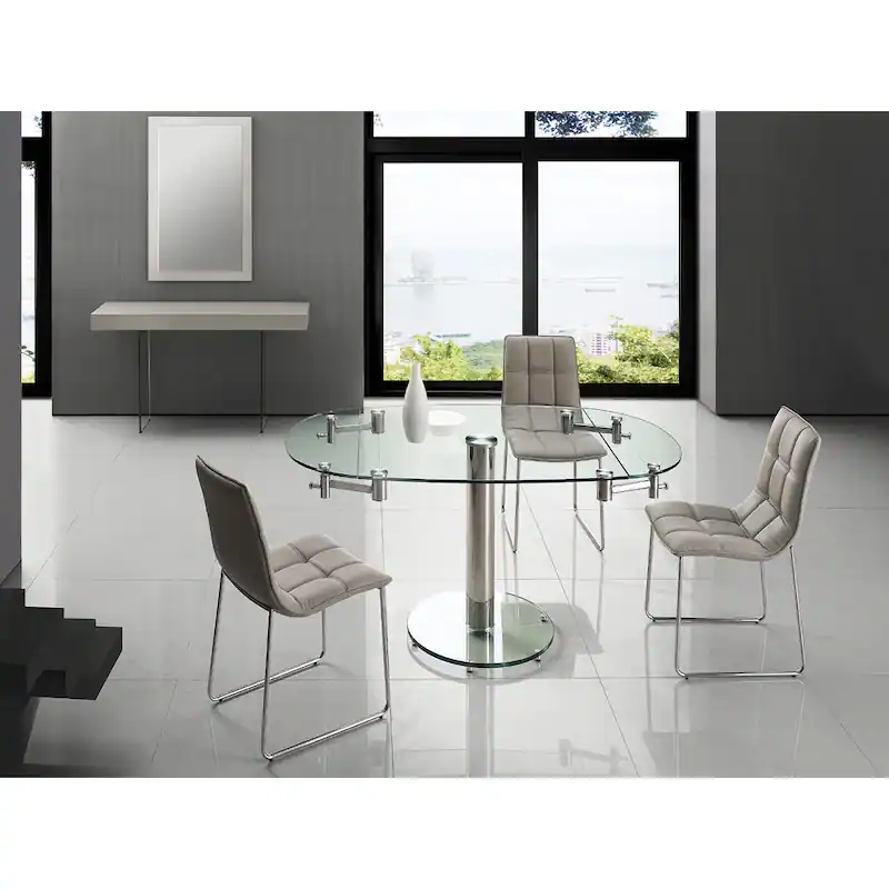 The Vida Extendable Dining Table combines modern sophistication with space-saving minimalist design. This modern table features a clear tempered glass top that rests upon a chrome pedestal and glass base. The Vida Dining Table also features two half-moon extensions which collectively extend the table an additional 13″ inches. Perfect for any small kitchen nook!